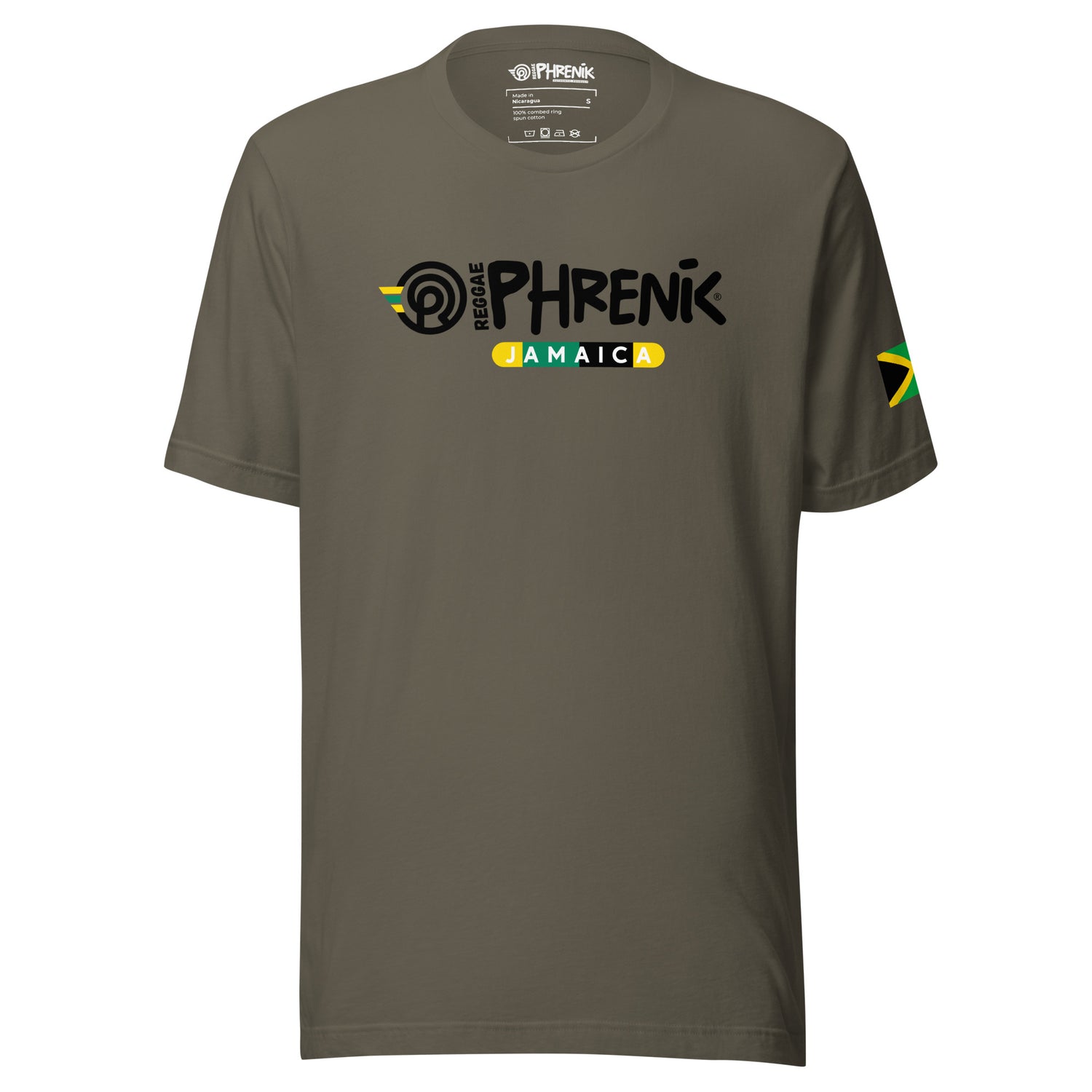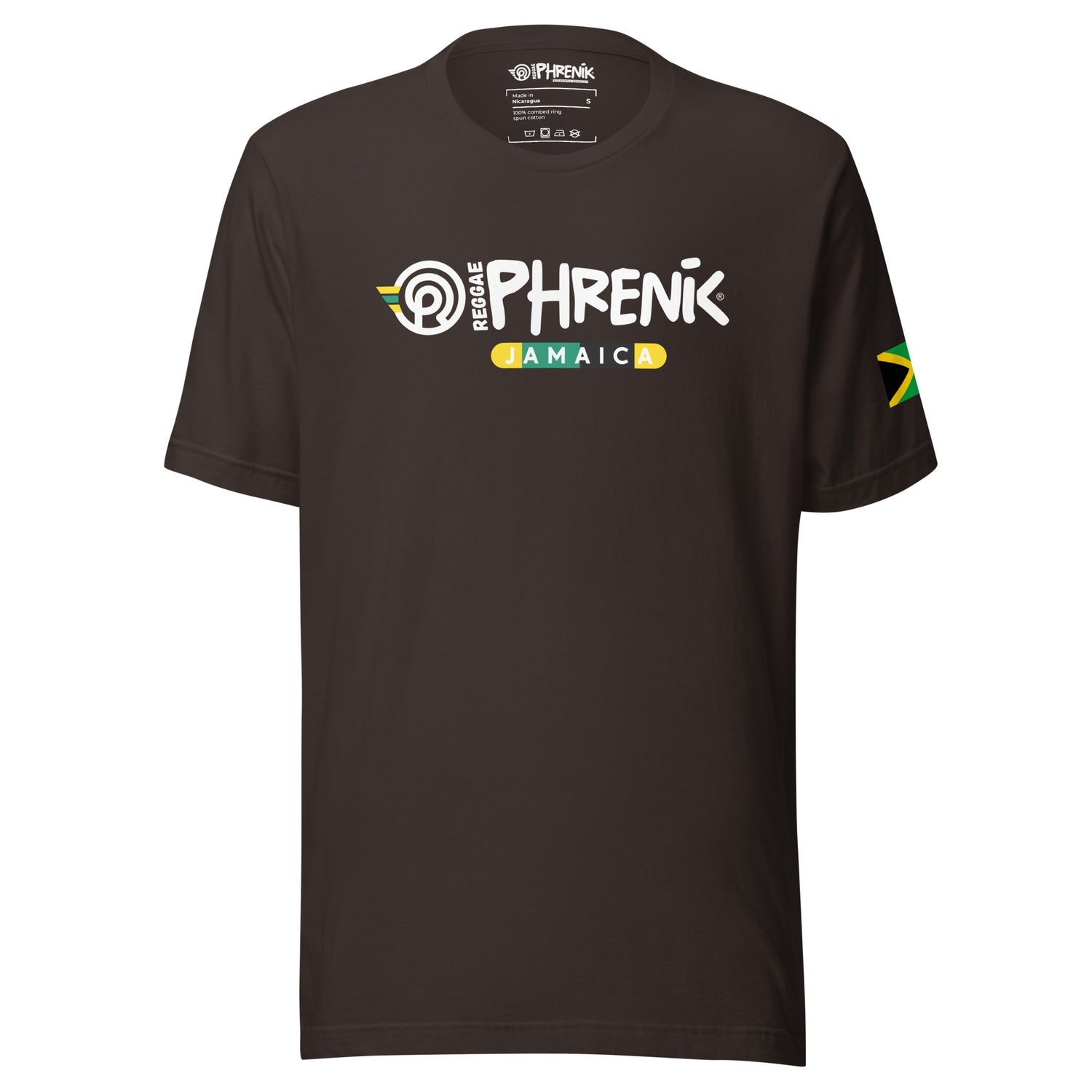Made from 100% combed and ring-spun cotton, the Jamaica Phreniks t-shirt is part of our Geo Collection. This shirt is soft, lightweight, and effortlessly cool, with its flattering fit for everyone. Pre-shrunk for added durability, it's ready to accompany you on your journey through the pulsating streets of Kingston and beyond. With side-seamed construction and shoulder-to-shoulder taping, this t-shirt symbolizes unity and solidarity, echoing the spirit of togetherness celebrated in reggae culture. Wear it proudly as you represent your love of Reggae culture and country.